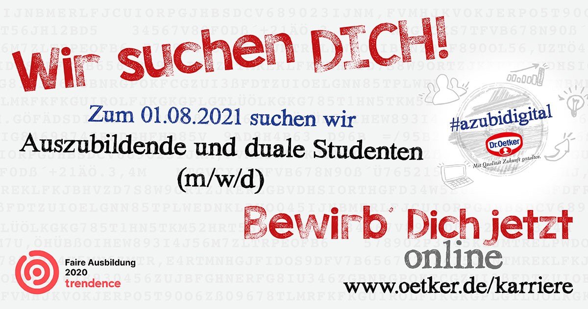 Was macht ein Kaufmann für Digitalisierungsmanagement (m/w/d)? Auf den Punkt gebracht: in die Digitalisierung von Geschäftsprozessen einsteigen und das aus einer ökonomisch-betriebswirtschaftlichen Perspektive. Diesen neuen Ausbildungsberuf und weitere spannende Ausbildungsberufe im kaufmännischen, gewerblich-technischen sowie im IT-Bereich bietet das in über 40 Ländern aktive Familienunternehmen Dr. Oetker an. Ab sofort können sich Schülerinnen und Schüler für das Ausbildungsjahr 2021 online unter www.oetker.de/karriere bewerben.