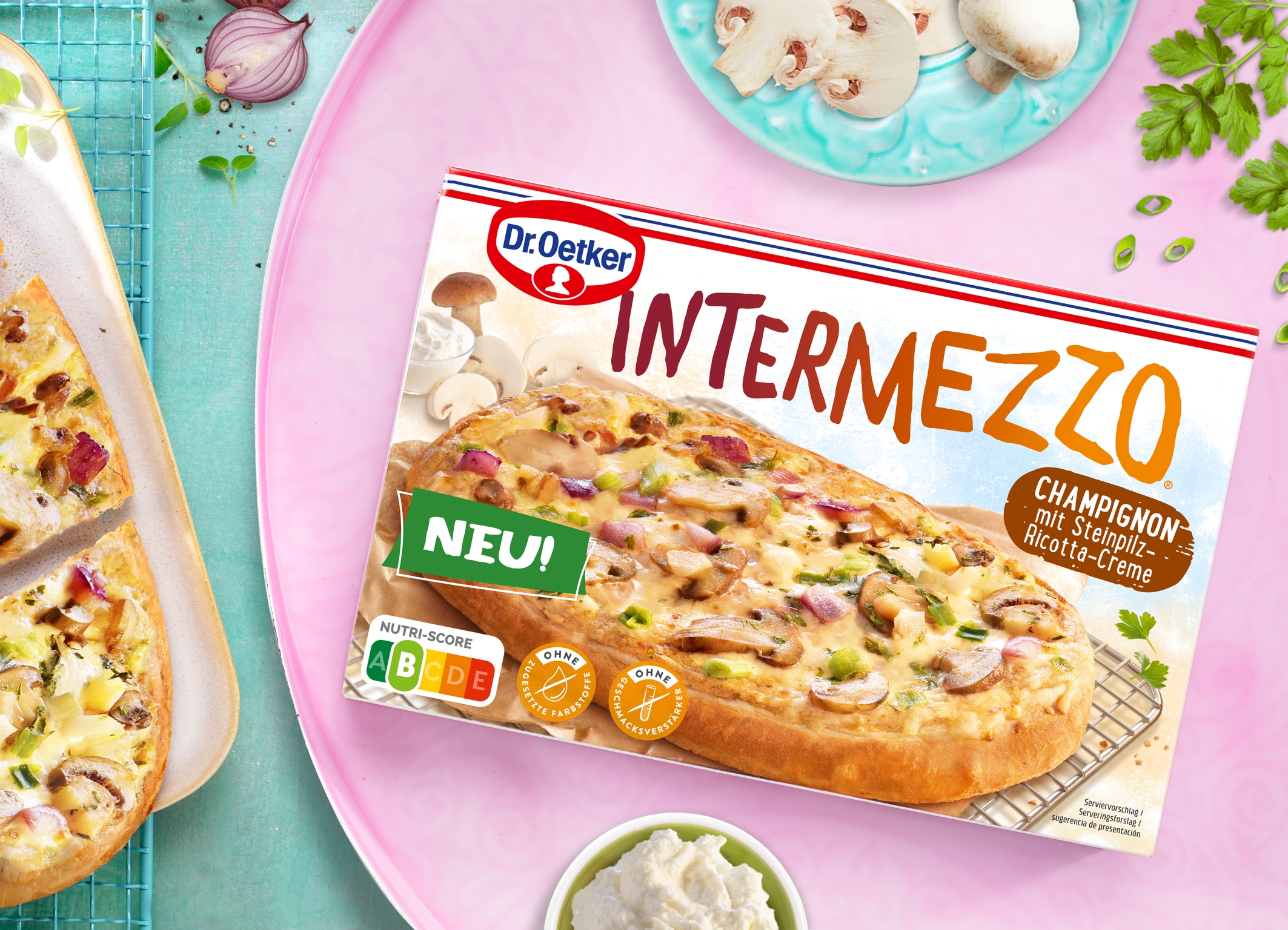 Ab August 2022 verspricht ein neues Intermezzo® von Dr. Oetker noch mehr Auswahl und köst-lichen Genuss: Champignonscheiben treffen auf dem ovalen und knusprigen Intermezzo® Boden auf eine aromatische Steinpilz-Ricotta-Creme. Eine herzhafte Käsemischung aus Mozzarella und Edamer macht die Rezeptur gemeinsam mit Frühlingszwiebeln, roten Zwiebeln und Petersilie perfekt. Das neue Intermezzo® Champignon mit Steinpilz-Ricotta-Creme punktet nicht nur geschmacklich, sondern auch mit einem hellgrünen Nutri-Score B. Wie bei allen Varianten gelingt die Zubereitung ganz unkompliziert: Schachtel auf, Ofen vorheizen und das Intermezzo® auf dem Rost im vorgeheizten Backofen bei 220 °C Ober- und Unterhitze für elf bis dreizehn Minuten aufbacken.