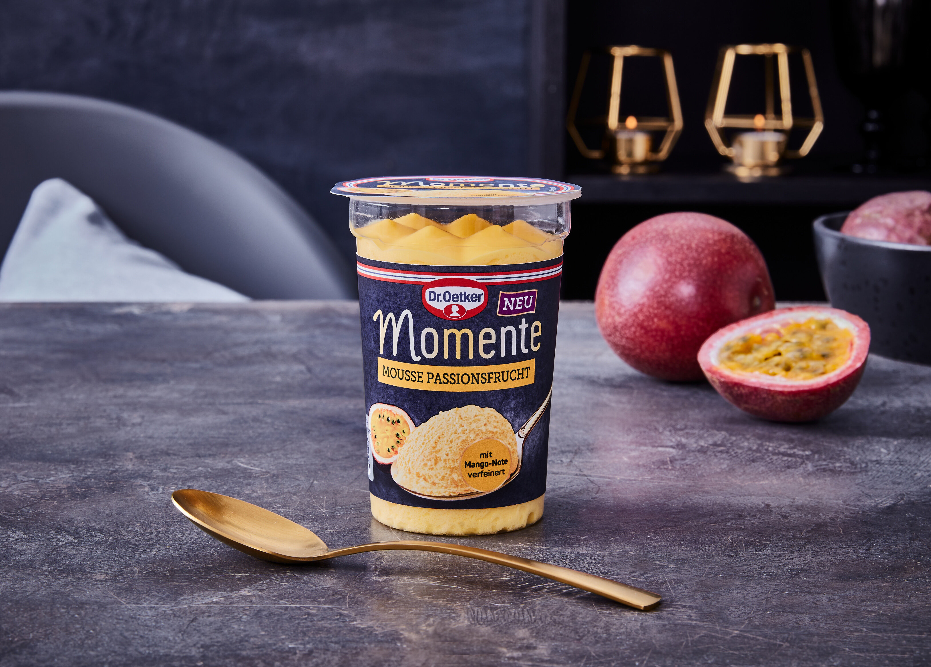 Die sommerliche Sorte Passionsfrucht erweitert das Dr. Oetker Momente Mousse-Sortiment.