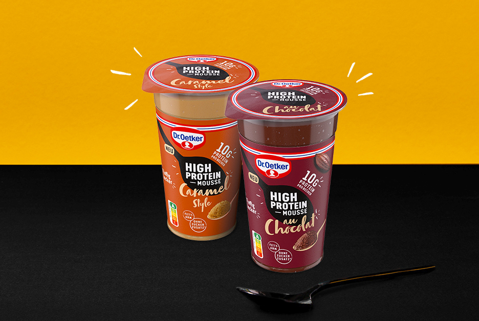 Ab Juni ergänzt das High Protein Mousse in den Sorten Mousse au Chocolat und Mousse Caramel Style das Protein-Sortiment von Dr. Oetker.