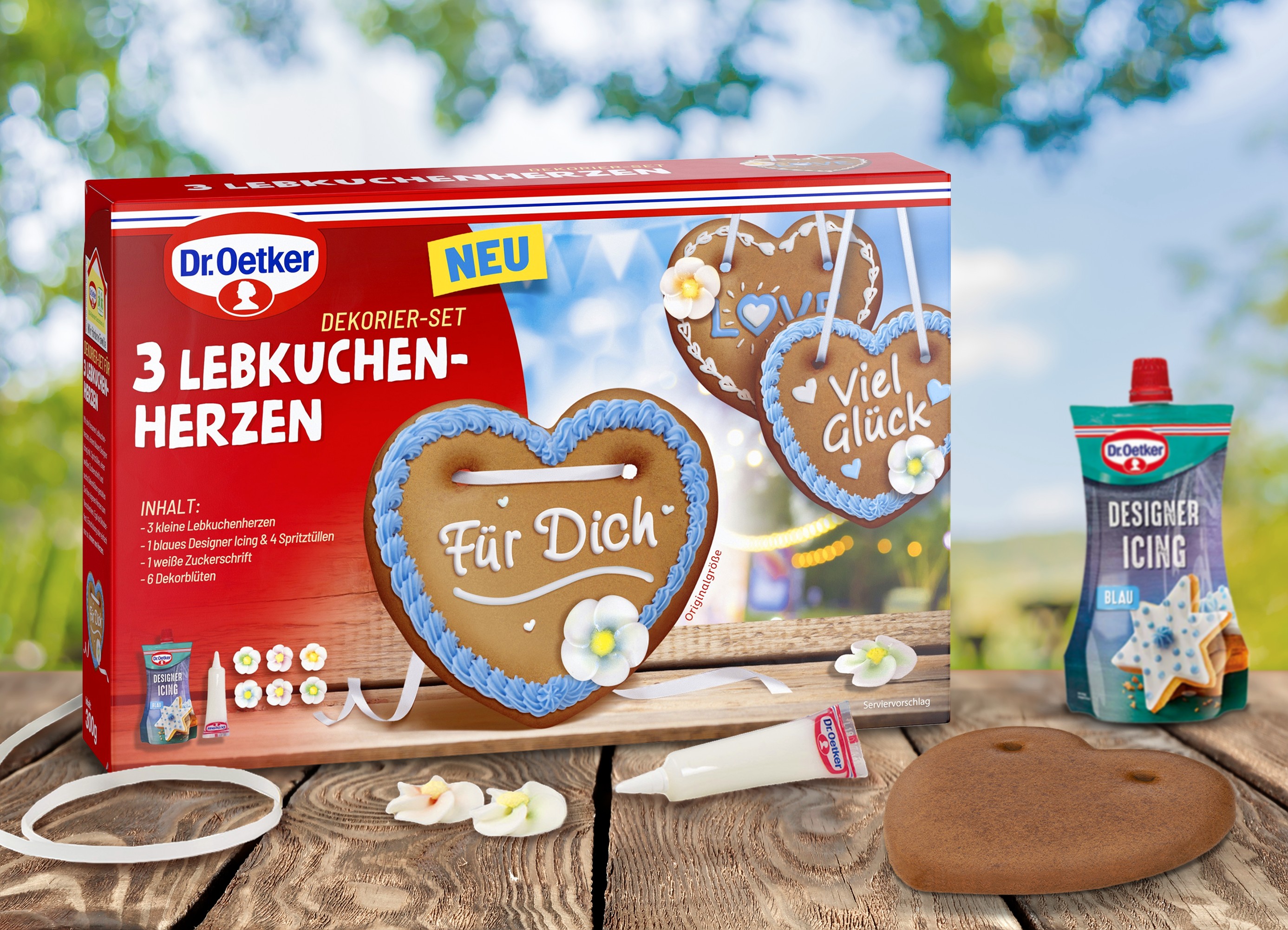 Sie sind bunt, verbreiten liebevolle Botschaften und haben Tradition: Lebkuchenherzen gehören zum Oktoberfest wie Brezen und das Riesenrad. Passend zur Wiesn 2022 präsentiert Dr. Oetker ab August die zweite Auflage des limitierten Dekorier-Sets mit drei kleinen Lebku-chenherzen und passenden Dekorier-Zutaten. Auch wer außerhalb des Oktoberfests Herzen sprechen lassen will, liegt mit dem Dekorier-Set genau richtig, denn personalisierte und selbst-gestaltete Gebäcke liegen weiterhin voll im Trend. Egal, ob als Mitbringsel für die beste Freundin, als Aufmerksamkeit zum Geburtstag oder als liebevoller Gruß für ganz besondere Menschen – mit dem praktischen Set von Dr. Oetker verwandeln sich Lebkuchenherzen im Handumdrehen in originelle Geschenke, die von Herzen kommen.