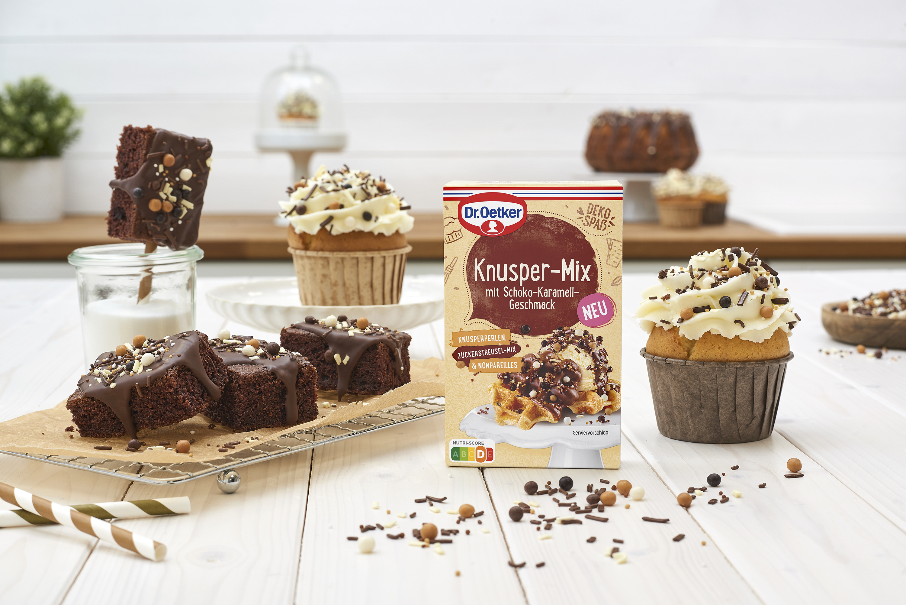 Mit dem neuen Knusper-Mix mit Schoko-Karamell-Geschmack sorgt Dr. Oetker ab Juli 2022 für leckere Abwechslung im Dekor-Regal.
