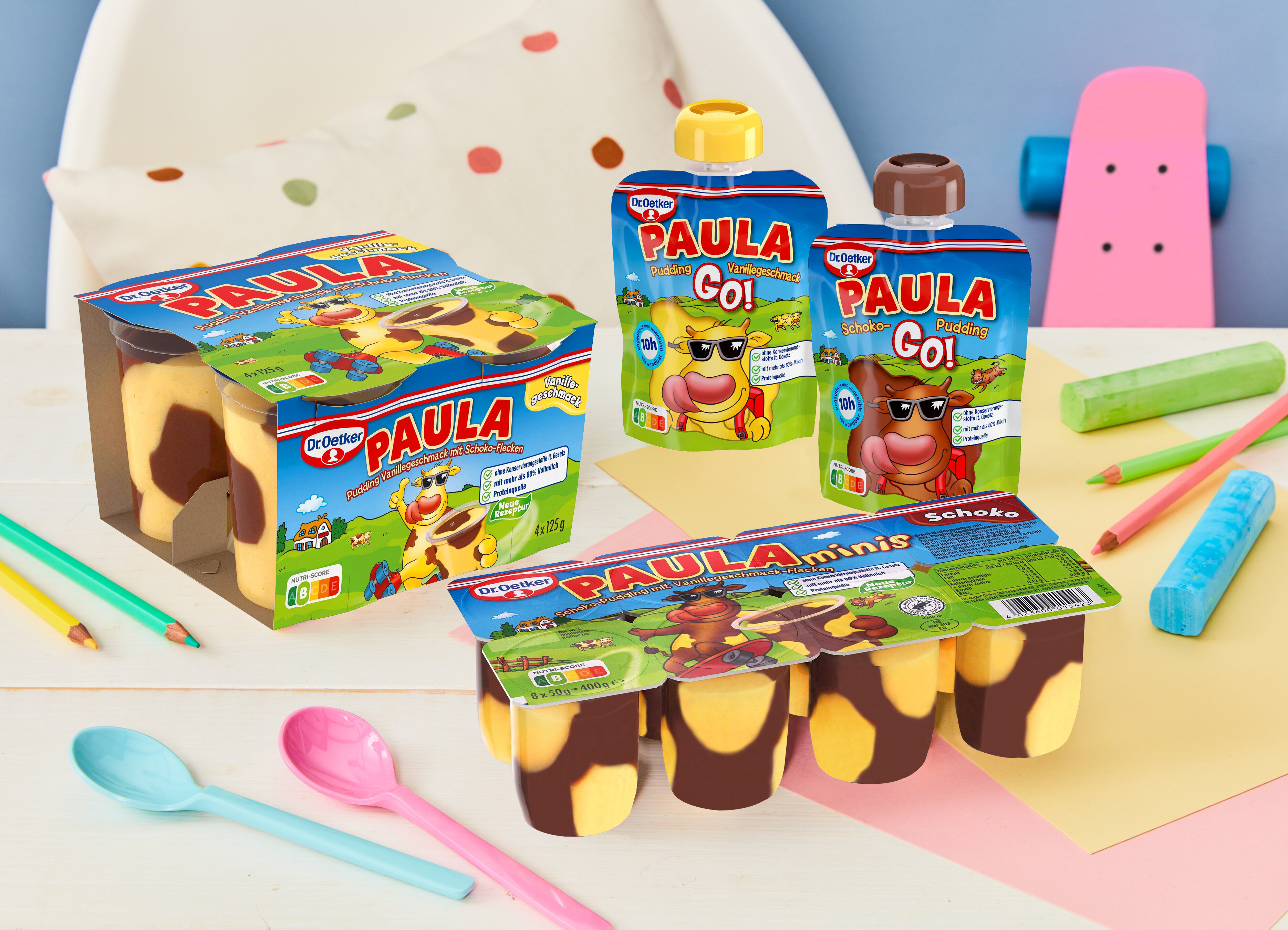 PAULA liebt ihre Abenteuer und ist immer in Aktion – egal ob mit Skateboard, Rollschuhen oder Cityroller. Die kuhle Kuh zeigt ihren Freunden und Fans, wie viel Spaß es macht in Bewegung zu bleiben. Dies spiegelt sich auch im neuen Verpackungsdesign von Dr. Oetker PAULA wider, welches ab März 2022 frischen Wind ins Kühlregal bringt. PAULA arbeitet stetig daran, dass ihr Pudding immer lecker schmeckt und so geht mit dem Relaunch auch eine neue Rezeptur einher. Zudem wird zukünftig der Nutri-Score direkt auf den Verpackungen zu finden sein. Durch die Rezepturoptimierung erhalten alle Sorten PAULA Pudding den Nutri-Score B. Für alle Puddingvarianten mit Schokolade wird zudem nur Rainforest Alliance-zertifizierter Kakao verwendet. Mit beiden Veränderungen kommt PAULA dem Wunsch ihrer Fans nach mehr Transparenz und verbesserten Nährwerten nach, was ganz im Zeichen der Dr. Oetker Sustainability Charter steht.