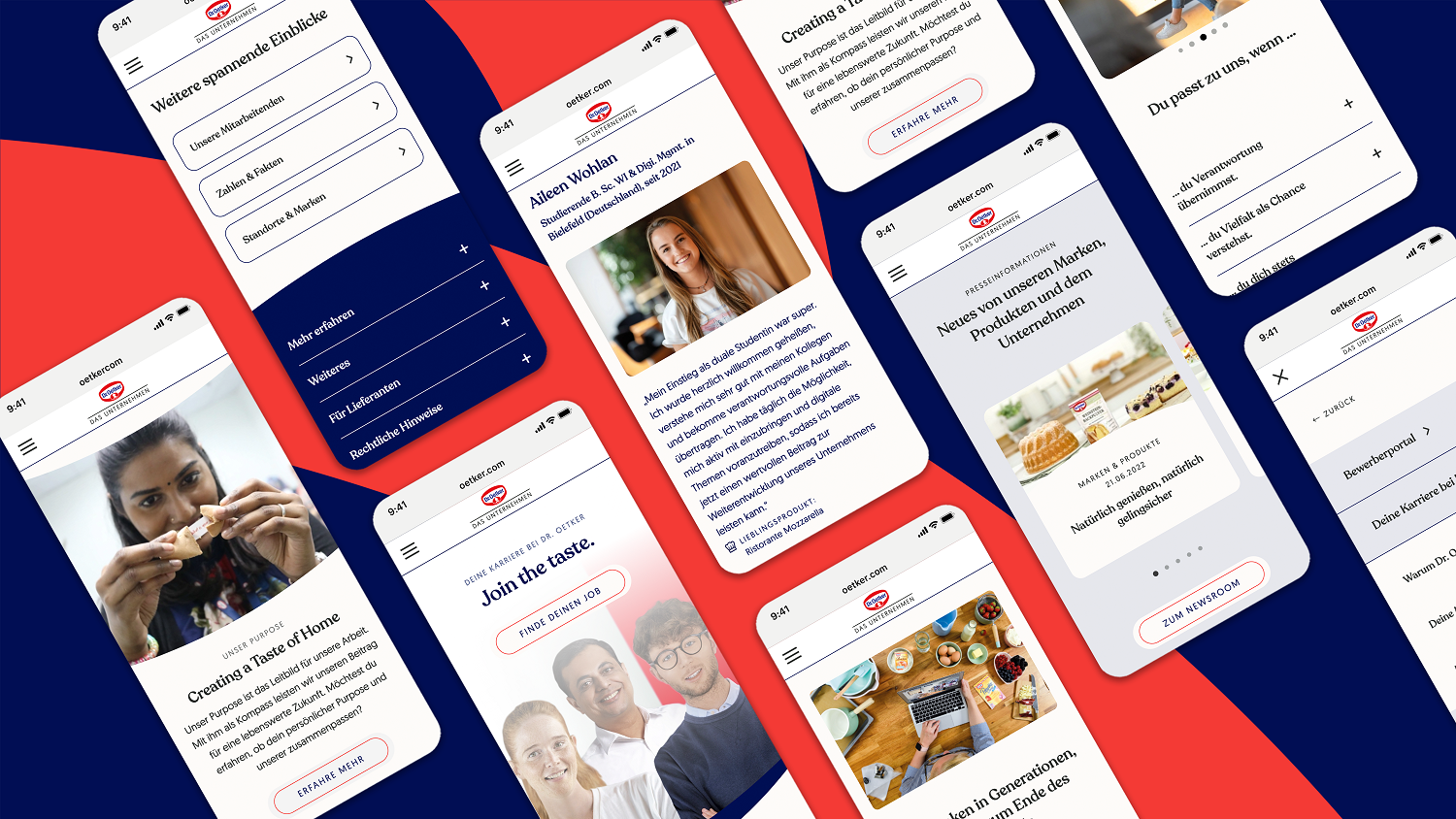 Dr. Oetker setzte den digitalen Auftritt der Marke, des Unternehmens und der Arbeitgebermarke komplett neu auf. In Strategie, Design und Tonalität aufeinander aufbauend, bilden die Markenwebsites aller Landesgesellschaften und die globale Corporate Website das neue Gesicht der externen Kommunikation von Dr. Oetker. Parallel dazu wurde eine digitale Employer-Branding-Kampagne unter dem Claim „Join the Taste" gestartet. Alle drei Projekte orientieren sich an dem Dr. Oetker Purpose „Creating a Taste of Home". Die neuen Plattformen bieten für jede Zielgruppe ein individuelles Zuhause, indem sie offen, authentisch und zugänglich sind.