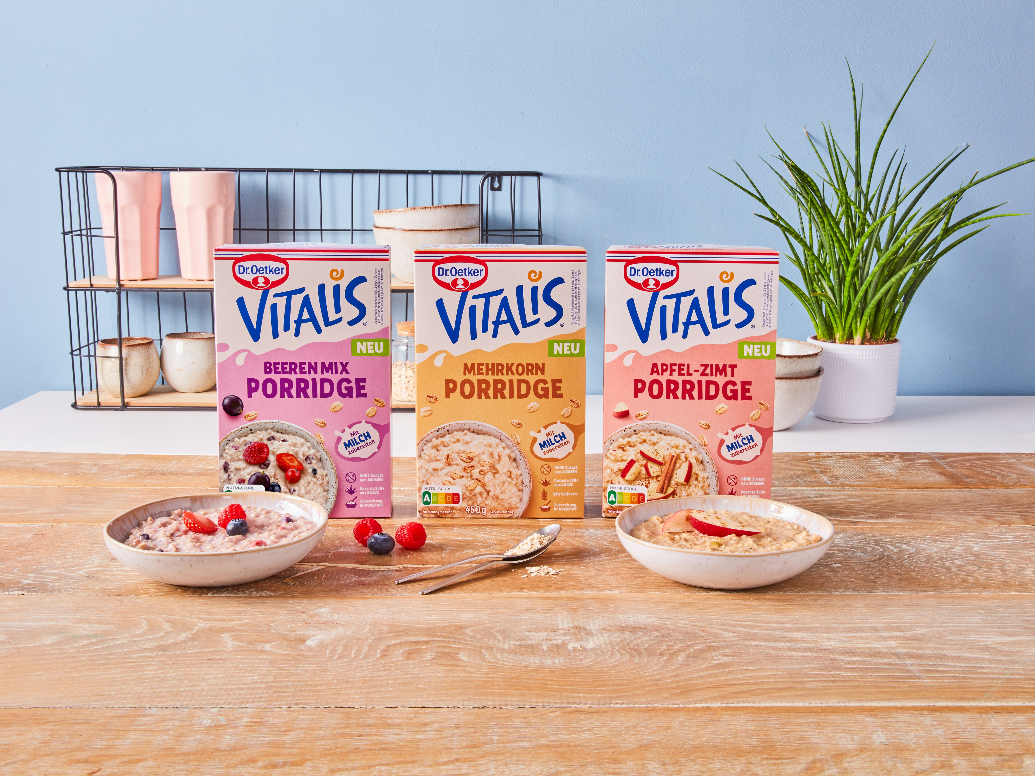 Das Vitalis Porridge Mehrkorn enthält eine kernige Mischung verschiedener Vollkorn-Getreideflocken aus Hafer, Gerste, Weizen und Dinkel. Beim Beeren Mix sind neben Vollkorn-Haferflocken u. a. Korinthen, gefriergetrocknete Beeren und gefriergetrocknete Erdbeeren enthalten. Die Sorte Apfel-Zimt Porridge beinhaltet Vollkorn-Haferflocken, getrocknete Apfelstücke und Zimt. Alle drei Sorten erhalten ihre dezente Süße aus der Agave und kommen ohne den Zusatz von Aromen aus. Zudem sind sie mit dem Nutri-Score A gekennzeichnet. Damit möchte Dr. Oetker im Rahmen der Sustainability Charter Konsumentinnen und Konsumenten eine bessere Vergleichbarkeit und somit eine bewusste Kaufentscheidung ermöglichen. Für das Frühstück unterwegs eignet sich auch weiterhin Vitalis Porridge im Portionsbeutel in den Sorten Classic, Beeren, Apfel-Zimt, Schoko und Pekannuss-Mandel. Für die Zubereitung in einer Schale oder großen Tasse benötigt man lediglich kochendes Wasser.