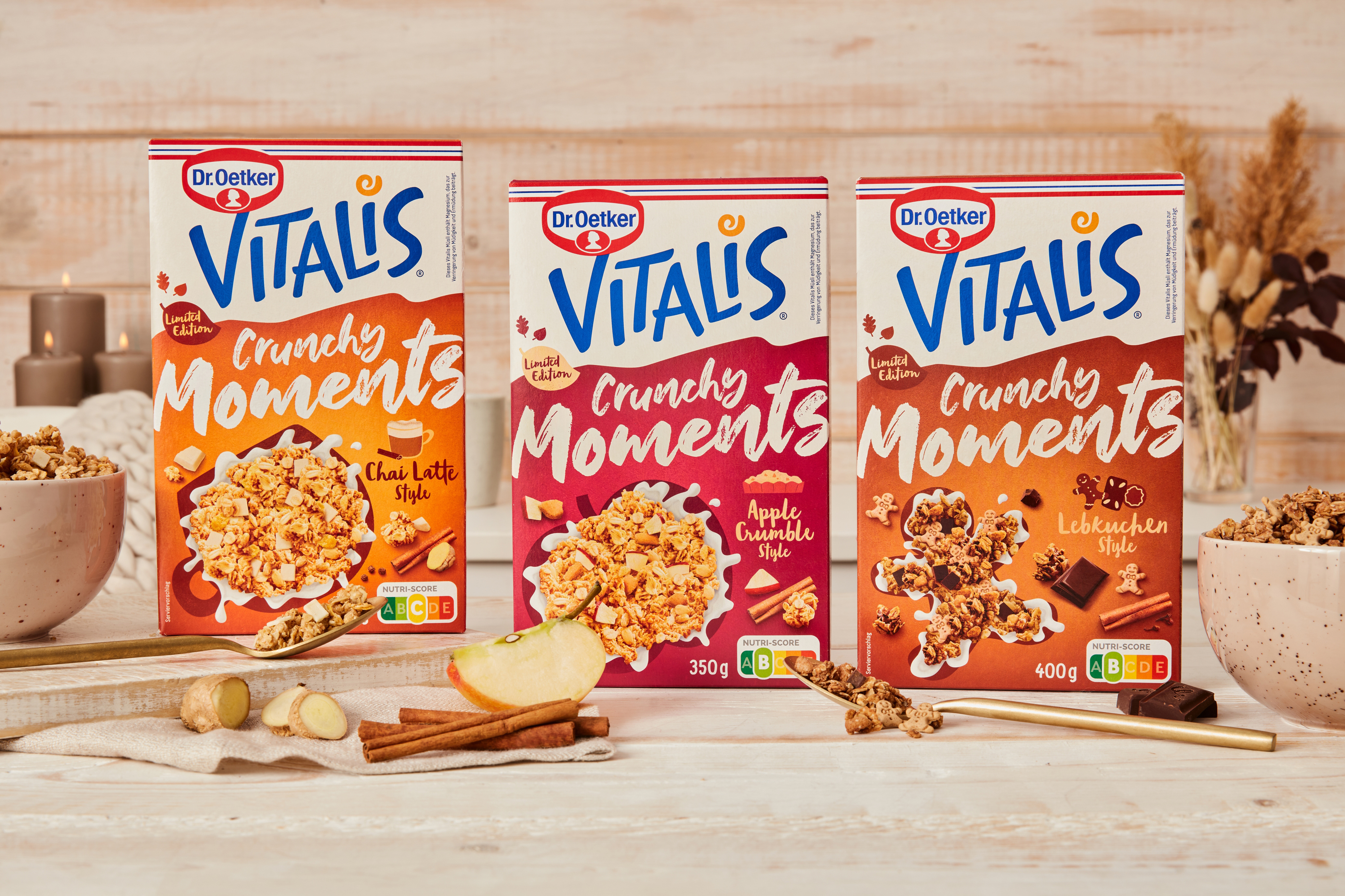 Dr. Oetker begeistert seit Anfang September 2022 mit dem limitierten Produkt Vitalis Crunchy Moments in drei Sorten.