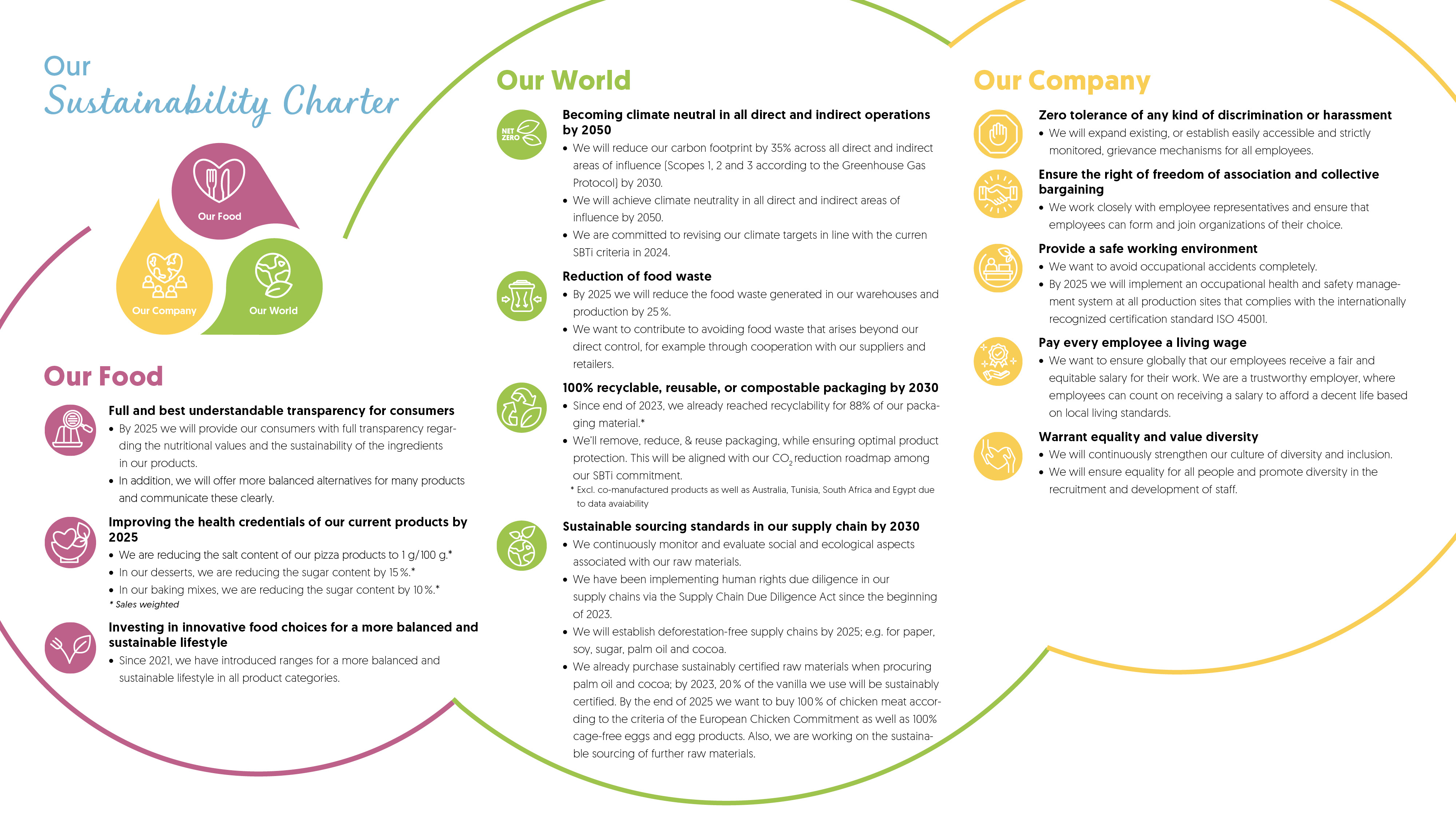 With the Dr. Oetker Sustainability Charter, we are committing ourselves to sustainable action. We have set ourselves concrete goals for this, which we assign to three dimensions: “Our Food”, “Our World” and “Our Company”.